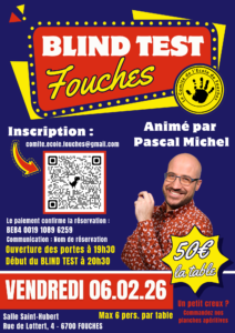 « Tous les Évènements Blind Test à Fouches 6 février 2026 @ 20 h 00 min « Blind Test à Athus + Google Agenda+ Exporter vers iCal Détails Date : 6 février 2026 Heure : 20 h 00 min